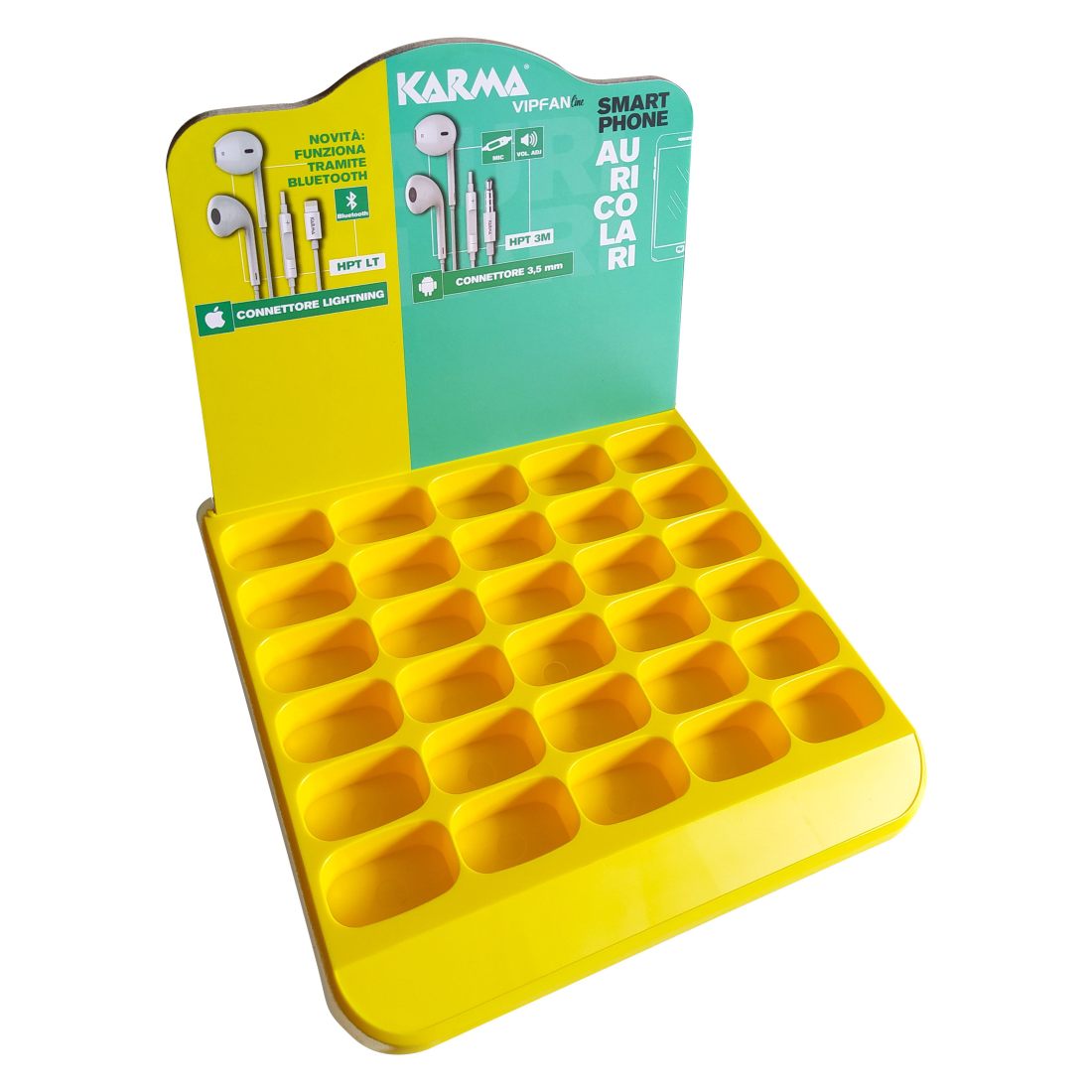 Ekspozytor na słuchawki z serii HPT. Składa się z plastikowej podstawy i kartonowego panelu. Można go zamontować w kilka sekund.